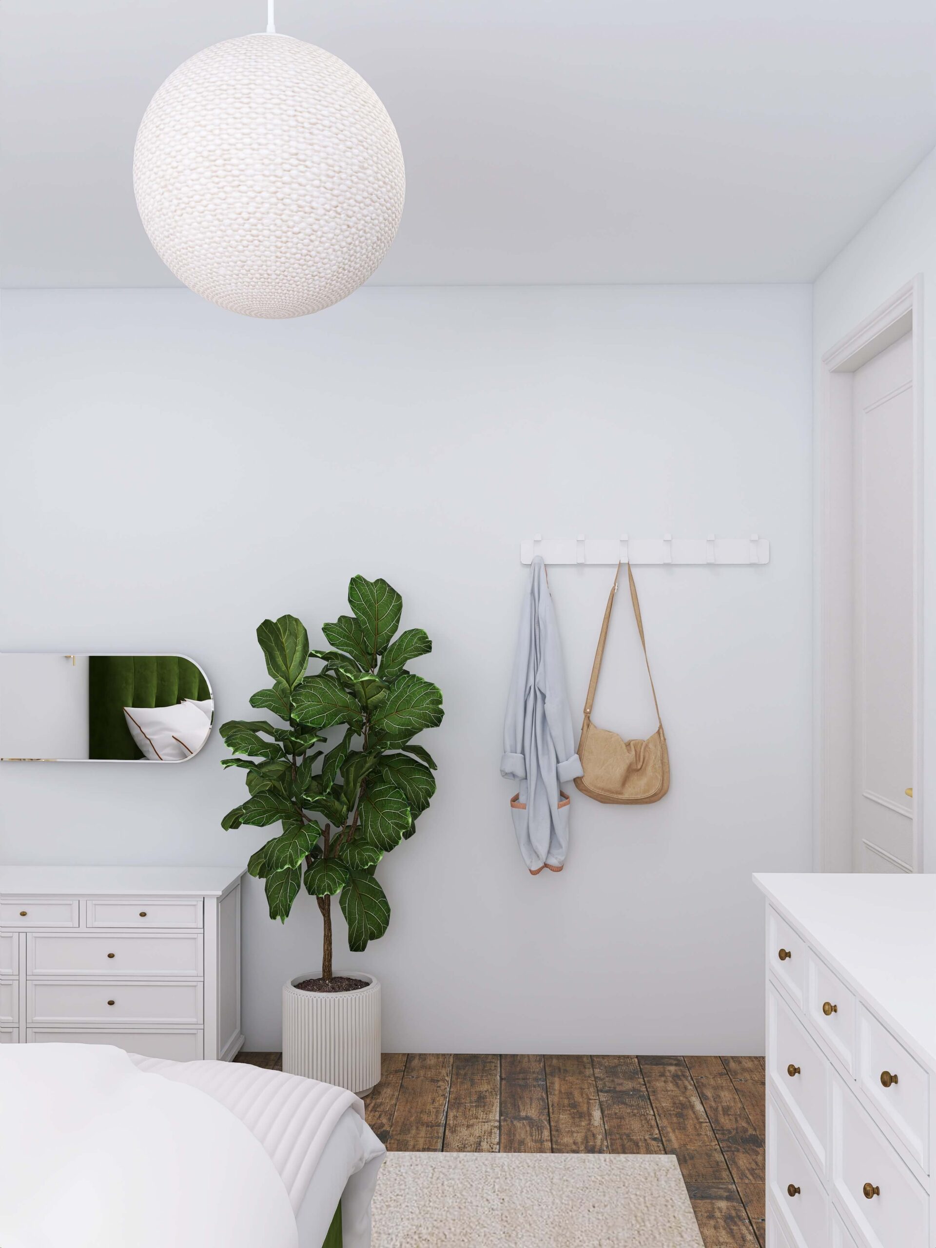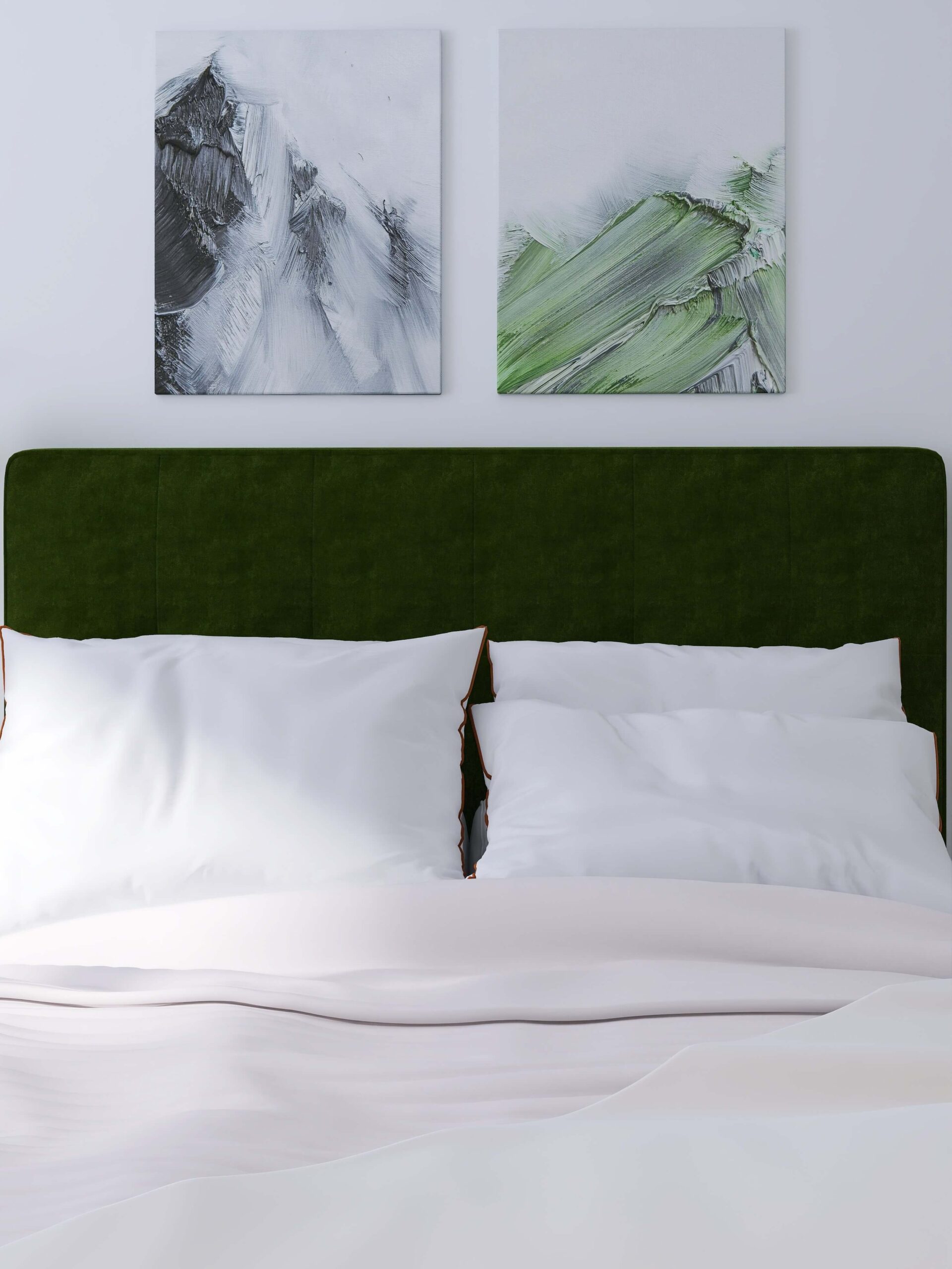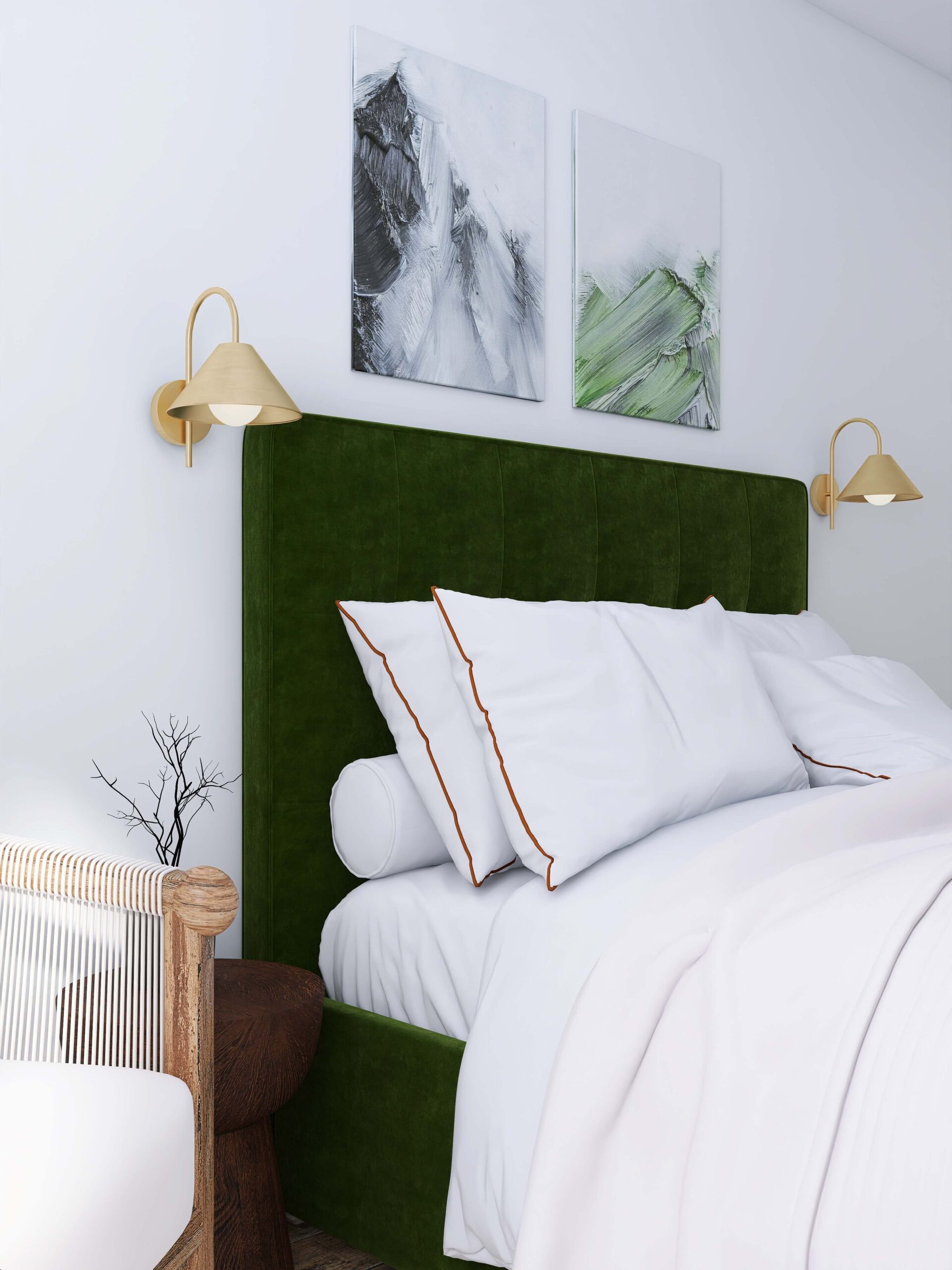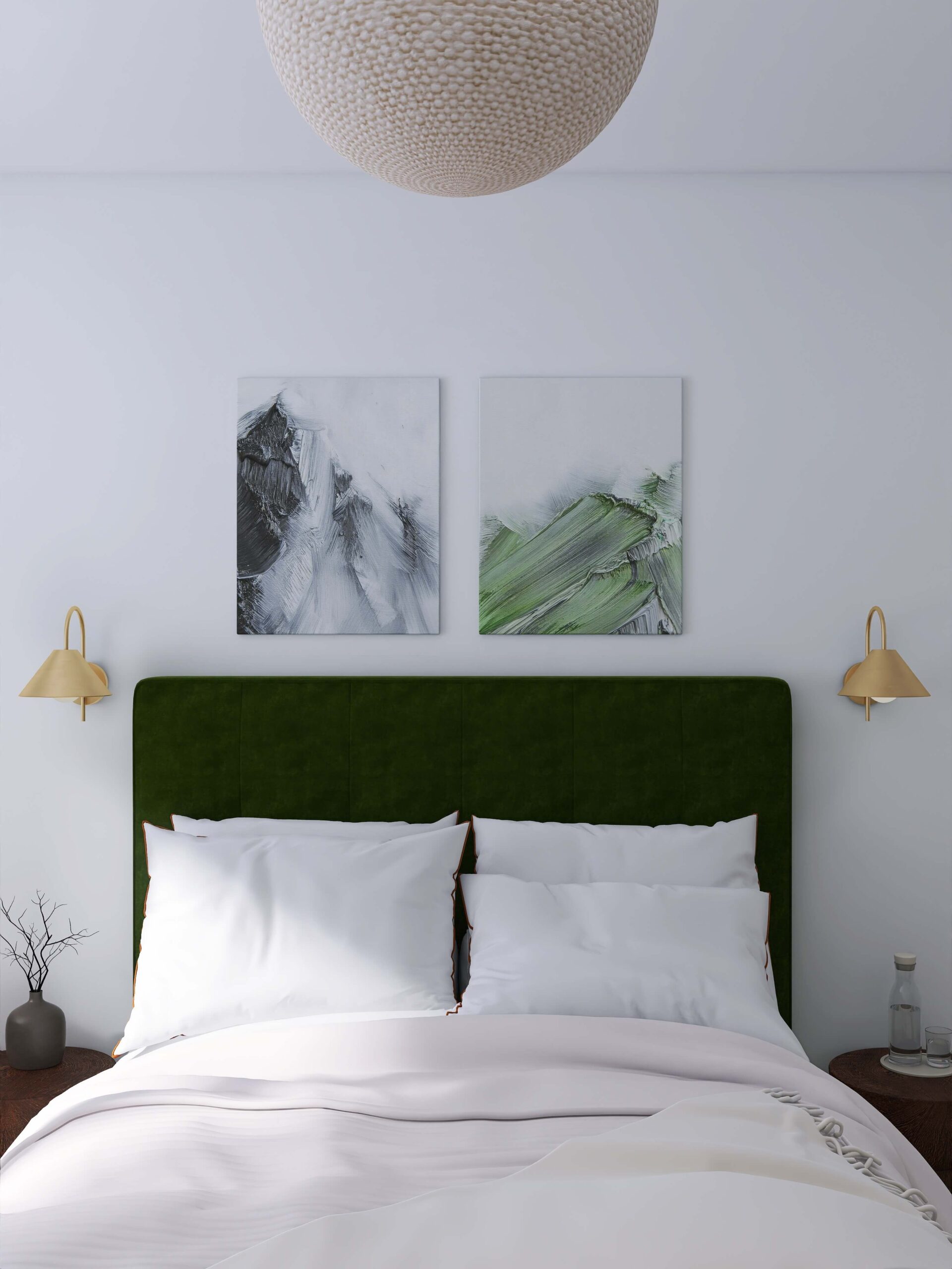 Dieses Schlafzimmer ist von der Ruhe der Farben Weiß und Grün geprägt – Weiß bringt Leichtigkeit und Weite, während tiefes Grün Geborgenheit schenkt. Natürliche Materialien, sanfte Stoffe und goldene Details ergänzen das Konzept und schaffen eine harmonische Balance zwischen Frische und Wärme. So entsteht ein Raum, der Stille, Erholung, und zugleich modernen Wohnkomfort bietet.